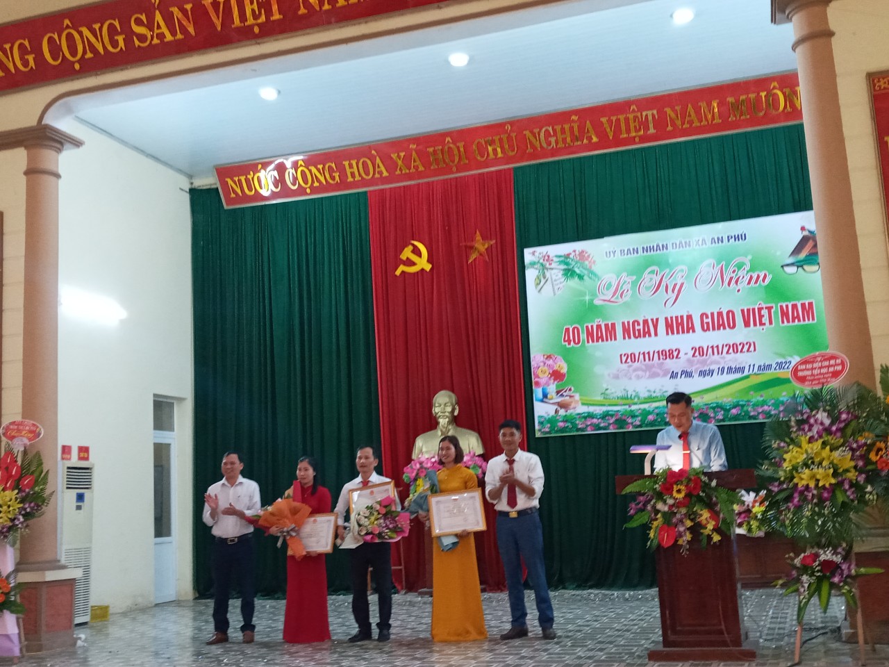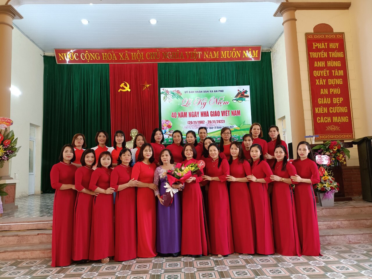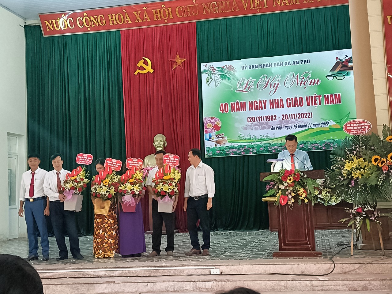 20/11/2022 A- A A+ | TRƯỜNG MN AN PHÚ A CHÀO MỪNG 40 NĂM NGÀY NHÀ GIÁO VIỆT NAM Xem Chia s? Ngày 19 tháng 11 năm 2022 Trường MN An Phú A chào mừng 40 ngày Nhà giáo Việt Nam. Sáng ngày 19 tháng 11 năm 2022 UBND xã An Phú tổ chức Lễ kỷ niệm chào mừng 40 năm Ngày nhà giáo Việt Nam, với sự có mặt của 4 nhà trường trong toàn xã. Tại buổi lễ diễn ra 7 tiết mựng văn nghệ chào mừng: đội nghi thức trường THCS An Phú lên chúc mừng gửi lời tri ân tới toàn thể các thầy cô giáo trong toàn xã. Buổi lễ diễn ra long trong và đầy ý nghĩa. Tập thể trường MN An Phú A vinh dự được đón nhận danh hiệu "TÂP THỂ LAO ĐỘNG TIÊN TIẾN' của UBND huyện Mỹ Đức. – Chúc mừng thầy cô nhân ngày 20/11, chúc thầy cô đủ tâm – trí – lực để có thể cống hiến nhiều hơn cho sự nghiệp trồng người. Một số hình ảnh tai buổi lễ của nhà trường: Tập tin đính kèm Tải về