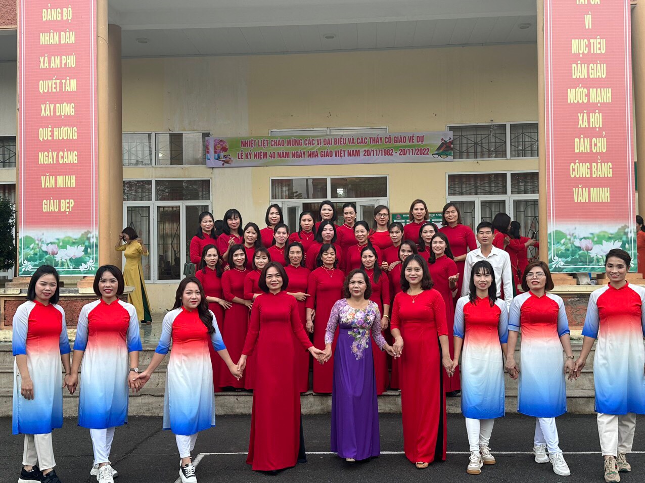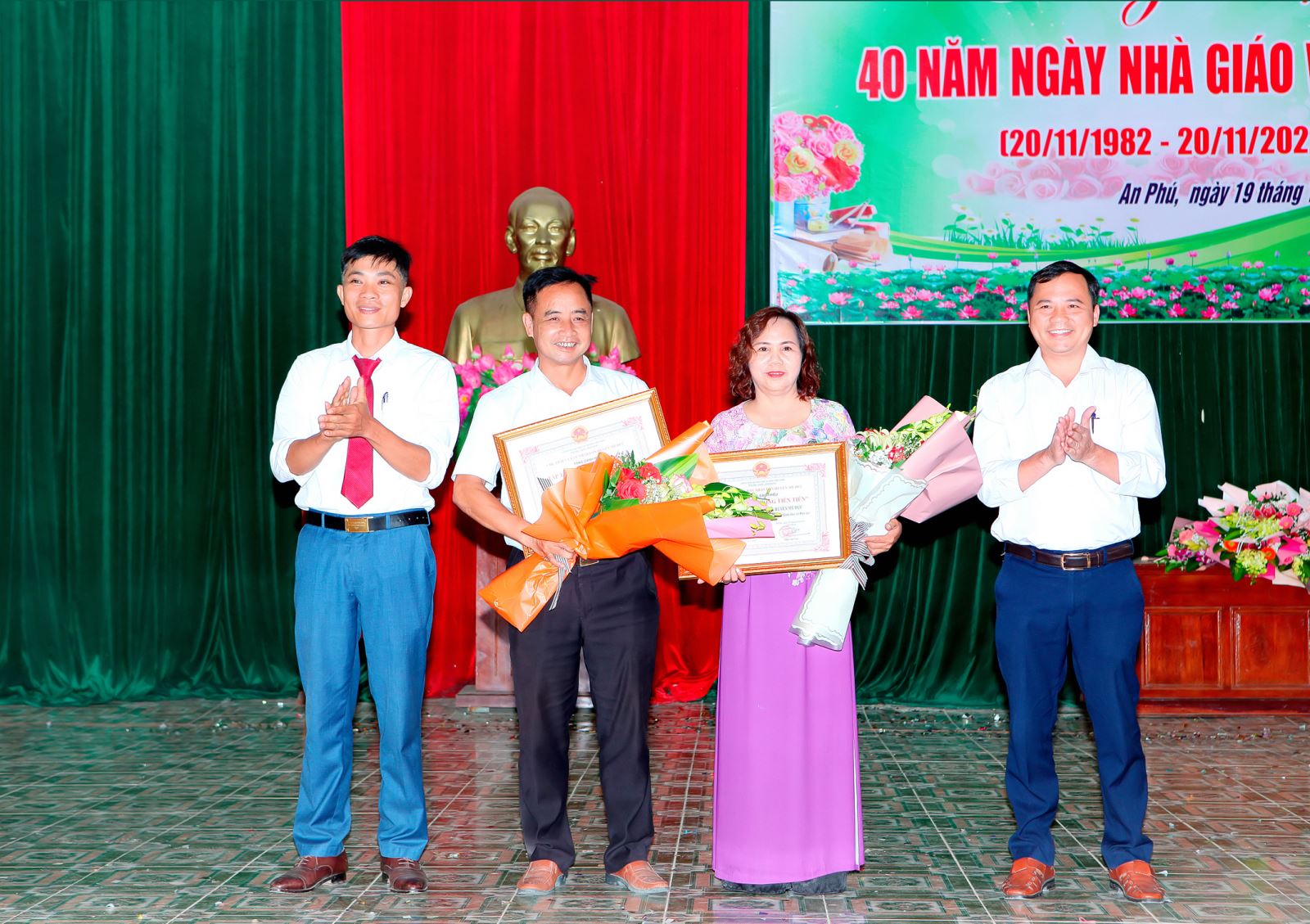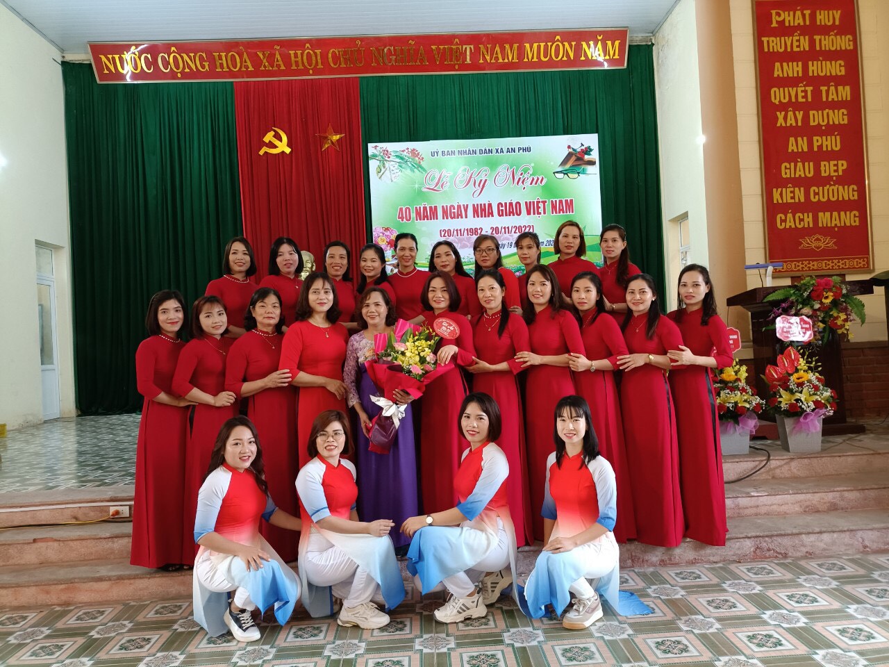 20/11/2022 A- A A+ | TRƯỜNG MN AN PHÚ A CHÀO MỪNG 40 NĂM NGÀY NHÀ GIÁO VIỆT NAM Xem Chia s? Ngày 19 tháng 11 năm 2022 Trường MN An Phú A chào mừng 40 ngày Nhà giáo Việt Nam. Sáng ngày 19 tháng 11 năm 2022 UBND xã An Phú tổ chức Lễ kỷ niệm chào mừng 40 năm Ngày nhà giáo Việt Nam, với sự có mặt của 4 nhà trường trong toàn xã. Tại buổi lễ diễn ra 7 tiết mựng văn nghệ chào mừng: đội nghi thức trường THCS An Phú lên chúc mừng gửi lời tri ân tới toàn thể các thầy cô giáo trong toàn xã. Buổi lễ diễn ra long trong và đầy ý nghĩa. Tập thể trường MN An Phú A vinh dự được đón nhận danh hiệu "TÂP THỂ LAO ĐỘNG TIÊN TIẾN' của UBND huyện Mỹ Đức. – Chúc mừng thầy cô nhân ngày 20/11, chúc thầy cô đủ tâm – trí – lực để có thể cống hiến nhiều hơn cho sự nghiệp trồng người. Một số hình ảnh tai buổi lễ của nhà trường: Tập tin đính kèm Tải về
